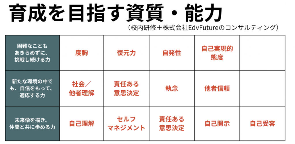 EdvPathを用いた非認知能力の測定は、教師の思い込みではなく根拠ある議論を可能にし、学校全体の共通言語を生み出した。 - 授業・特活・学級経営の中で意図的に育成すること